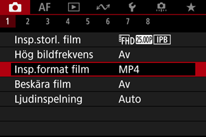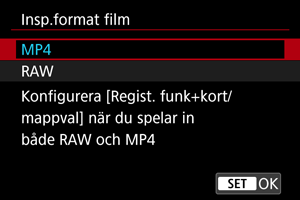 Du kan ange formatet på videofilerna som spelas in. För inspelning i RAW+MP4 ska du välja [,