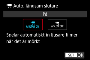 Du kan välja om du vill spela in filmer som är ljusare och med mindre brus än när inställningen är inställd på [Av] genom att automatiskt göra slutartiden långsammare vid svagt ljus.