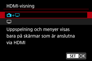 Kamerafunktioner såsom bildvisning och menyvisning visas på den andra enheten via HDMI och inte på kamerans skärm.