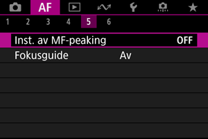 - MF-peaking kan vara svår att urskilja vid höga ISO-tal, särskilt när utvidgat ISO är inställd. Sänk om nödvändigt ISO-talet eller ställ in [Peaking] på [Av].