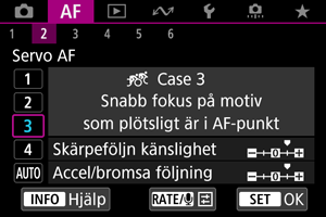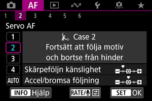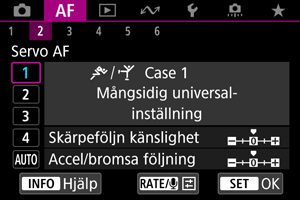 Fotografering med Servo AF kan enkelt anpassas till dina motiv eller fotograferingssituationer genom att du väljer ett Case-alternativ. Den här funktionen kallas för ”Konfigurationsverktyg för AFet”.