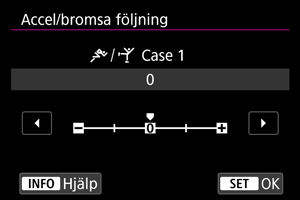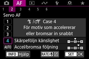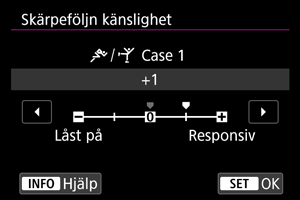 Du kan justera parametrarna manuellt ((1) skärpeföljningskänslighet och (2) spårning av acceleration/retardation) för Case 1 till Case 4.