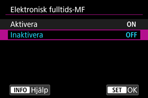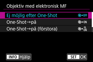 För objektiv utrustade med elektronisk manuell fokusering kan du ange hur manuell fokusjustering ska användas med One-Shot AF.