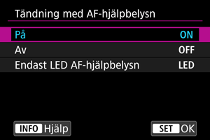Omöjliggör tändning med AF-hjälpbelysning. Välj detta om du inte vill att AF-hjälpbelysningen ska tändas.