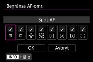 Du kan begränsa AF-områdena till de områden du vanligtvis använder. Välj den tillgängliga AF-områden och tryck på för att lägga till en bock [