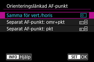 Du kan ställa in olika typer av AF-områden eller -positioner för AF-punkter för vertikal och horisontell fotografering.