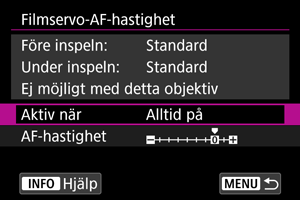 Du kan ställa in [Alltid på] så att AF-hastigheten alltid aktiveras för filminspelning (före och under filminspelning) eller ställa in [Under inspelning] så att AF-hastigheten bara aktiveras vid filminspelning.