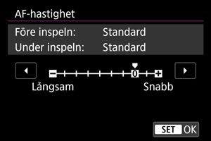 Du kan ställa in AF-hastigheten (fokusövergångshastigheten) från standardhastigheten (0) till långsam (sju olika nivåer) eller snabb (två nivåer) så att du får önskad effekt vid filmskapning.