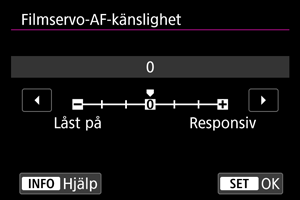 Du kan justera skärpeföljningskänsligheten (med sju olika nivåer), vilket påverkar känsligheten om motivet kommer bort från AF-punkten vid filmservo-AF, som när störande motiv rör sig över AF-punkter när du panorerar.