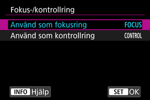 - Den här menyn visas inte om objektiv med en brytare för fokus/kontrollringen används. Använd objektivet för att konfigurera funktionalitet på fokus/kontrollringen.