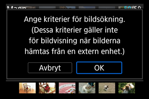 Du kan filtrera bildvisningen efter dina sökkriterier. Om du angett bildsökningskriterier kan du bara visa de hittade bilderna. Du kan också skydda, gradera, spela upp ett bildspel och tillämpa andra funktioner på filtrerade bilder.