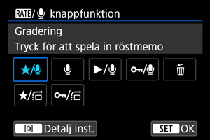 Du kan tilldela bildgraderingar/skydd/radering, inspelning/uppspelning av röstmemo eller bildsökning i samband med inmatningsratten till knappen