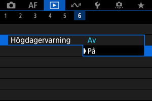 Du kan ange att överexponerade högdagrar ska blinka på visningsskärmen. Om du vill ha mer detaljerad kontrast i blinkande områden där kontrasten ska vara mera verklighetstrogen, ställer du in exponeringskompensationen på ett negativt värde och tar om bilden för att få ett bättre resultat.