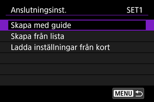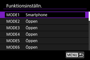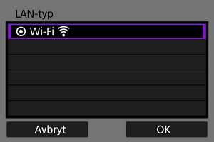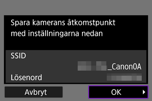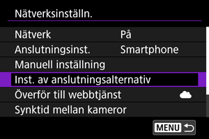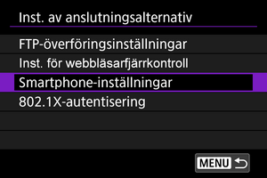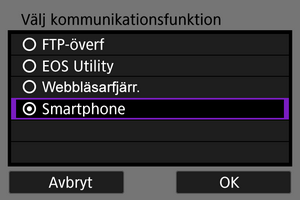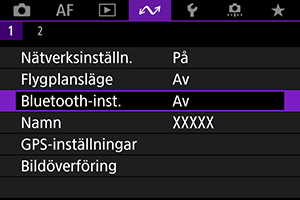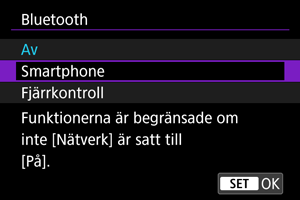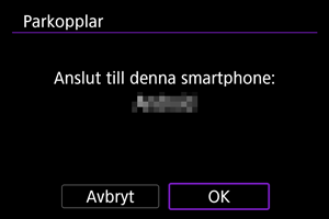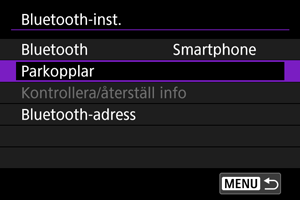 - Bluetooth-parkoppling med en smartphone är inte möjlig när kameran är ansluten till andra enheter via Wi-Fi eller ansluten till ett trådlöst LAN. Avsluta Wi-Fi- eller den trådlösa LAN-anslutningen genom att välja [Anslutningsinst.] i [