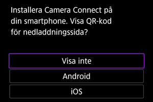 - Om Camera Connect inte har installerats, välj [Android] eller [iOS], skanna QR-koden som visas med din smartphone, öppna Google Play eller App Store och installera Camera Connect.