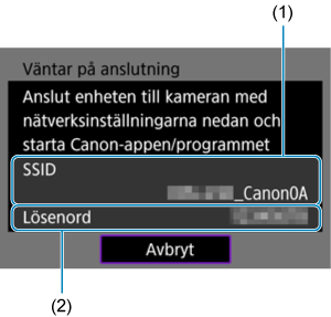 - Kontrollera SSID (1) och lösenord som (2) visas på kameraskärmen.