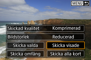 Skicka alla bilder som matchar sökkriterierna i [: Ange kriterier för bildsökn.] samtidigt. Se Ange kriterier för bildsökning för information gällande [Ange kriterier för bildsökn.].