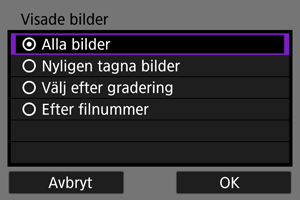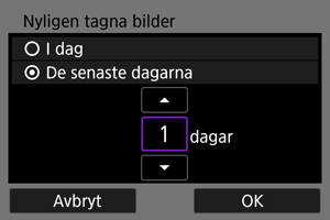 - När [De senaste dagarna] väljs blir de bilder visningsbara som tagits under det angivna antalet dagar före dagens datum. Använd [