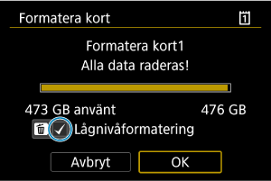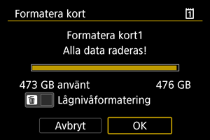 - Vid lågnivåformatering kan du avbryta formateringen genom att välja [Avbryt]. Den vanliga formateringen är redan klar och du kan använda kortet som vanligt.