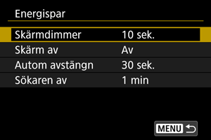 Du kan justera tidpunkten för när skärmen blir ljussvagare och sedan stängs av, när kameran stängs av och när sökaren stängs av om kameran lämnas inaktiv (ljussvagare skärm, skärm av, automatisk avstängning och sökare av).
