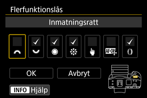 Ange vilka kamerakontroller som ska låsas när flerfunktionslåset är på. Detta kan förebygga att du ändrar inställningar av misstag.