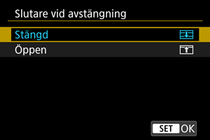 Du kan ställa in om slutaren ska vara öppen eller stängd när kamerans strömbrytare är inställd på Avstängd.