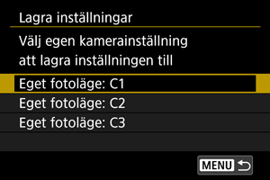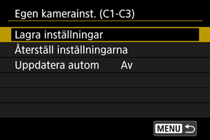 - Beroende på menyalternativen kanske inställningsalternativ, som har ändrats med andra fotograferingsmetoder, inte kan överföras till inställningarna Egen kamerainställning.