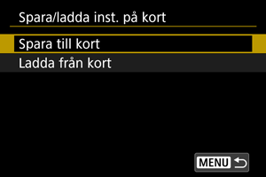 - Upp till tio kamerainställningsfiler kan sparas på ett kort. Antingen skriv över befintliga filer eller använd ett annat kort om ett kort redan har tio kamerainställningsfiler.