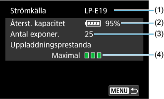 - (2) Batteriindikatorn () med återstående batterinivå i steg om 1 %.