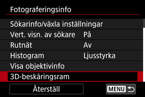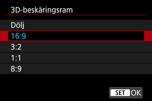 Om du ska beskära filmer som har spelats in med RF-S7.8mm F4 STM DUAL kan du en 3D-beskärningsram ses på filminspelningsskärmen (under standby och inspelning) för att göra dig medveten om den slutliga bildvinkeln som uppstår efter redigering.