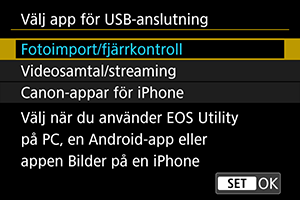Välj om du vill använda EOS Utility efter att du har anslutit till en dator eller om du använder dedikerade Android-appar eller iOS-versionen av Photos.