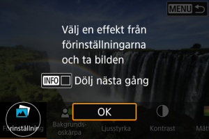 För att spara den aktuella inställningen i kameran ska du trycka på [Spara] på inställningsskärmen [Creative Assist] och sedan välja [OK]. Upp till tre förinställningar kan sparas som [USER*]. Efter att tre har sparats måste en befintlig [USER*]-förinställning skrivas över för att en ny ska kunna sparas.