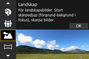 Använd läget [Landskap] (Landskap) för utsträckta vyer eller för att fokusera både på nära och långt håll. För kraftiga blå och gröna färger och skarpa och klara bilder.