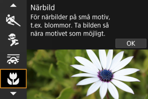 Använd läget [] (Närbild) för närbilder på små motiv såsom blommor. Om du vill få små föremål att verka betydligt större använder du ett makroobjektiv (säljs separat).