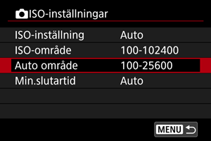 Du kan ställa in det automatiska ISO-området för ISO auto mellan ISO 100–102400. Minimum kan ställas in till ISO 100–51200 och det högsta inom ISO 200–102400 i ökningar om 1 steg.