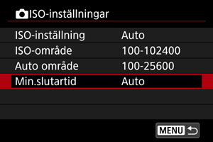 För att förhindra att slutartiderna ställs in för lågt automatiskt kan du ställa in minsta slutartid för ISO Auto.