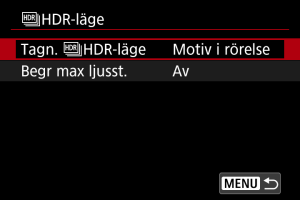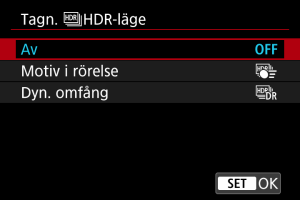 : Visa simulering] satt till ett annat alternativ än [Av] när HDR är satt till [Motiv i rörelse] eller [Dyn. omfång].
