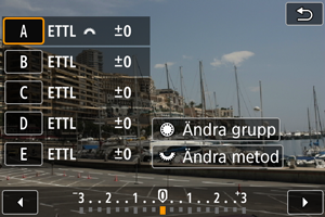 När du tittar på inspelningsskärmen i trådlös multiblixtfotografering kan du konfigurera inställningarna för varje blixtgrupp genom att trycka på knappen som är tilldelad till [Snabb blixtgruppkontroll] i [: Anpassa knappar]. Detta exempel är baserat på att tilldela knappen