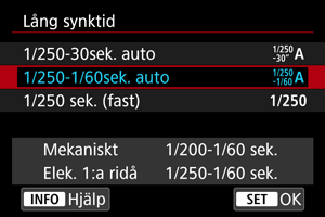 Du kan ställa in blixtsynkroniseringstid för fotografering med metoderna P eller Av. Observera att den maximala hastigheten för blixtsynkronisering varierar beroende på [: Slutarläge]-inställningen. Den är 1/250 sek. när den är satt till [Elek. 1:a ridå] och 1/200 sek. när den är satt till [Mekaniskt].
