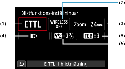 Den informationen som visas på skärmen, skärmens position och tillgängliga alternativ varierar beroende på Speedlite-modellen, dess inställningar för egen programmering, blixtläget och andra faktorer. Mer information om funktionerna för Speedlite finns i användarhandboken till Speedlite.