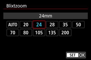 Med Speedlite som har blixthuvud med zoom kan du ställa in blixtens täckning.