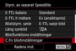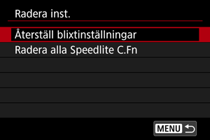 - Välj [Återställ blixtinställningar] eller [Radera alla Speedlite C.Fn].