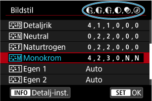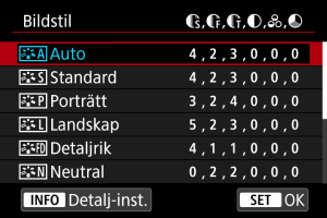 Genom att välja en förinställd bildstil kan du få bildegenskaper som stämmer överens med ditt fotografiska uttryck eller motivet.