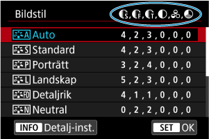 Ikoner på bildstilsskärmen representerar [Styrka], [Finhetsgrad] och [Tröskel] för [Skärpa] såväl som [Kontrast] och andra parametrar. Numret anger värdena för dessa inställningar för respektive bildstil.