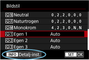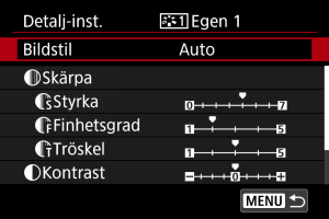 - Om en bildstil redan har registrerats under [Egen *] kan du radera parameterinställningarna för den registrerade bildstilen genom att ändra egen bildstil.