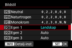 Du kan välja en bildstil såsom [Porträtt] eller [Landskap] samt justera den efter önskemål och registrera den under [Egen 1] – [Egen 3]. Användbart när du skapar flera bildstilar med olika inställningar.