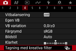 - Vissa objekt på AF-fliken är inte tillgängliga med [Fisheye-effekt] eller [Miniatyreffekt] valt.