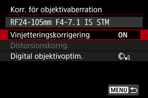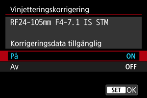 - Om du använder ett objektiv som inte kommer från Canon bör du ställa in korrigeringarna på [Av] även om [Korrigeringsdata tillgänglig] visas.