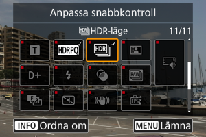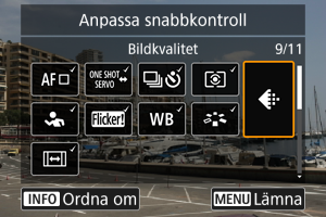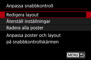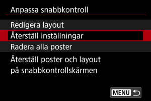 - Välj [Återställ inställningar] för att återställa standarposterna och -layouten för snabbkontrollskärmen.