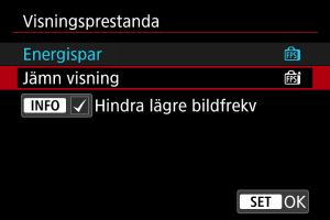 - Vissa fotograferingsförhållanden och kamerafunktioner kan förhindra jämn visning med hög bildhastighet, även när den är satt till [Jämn visning].